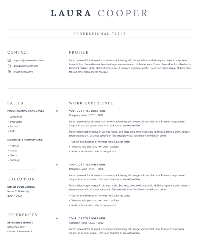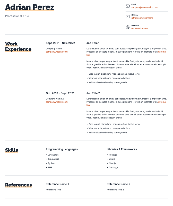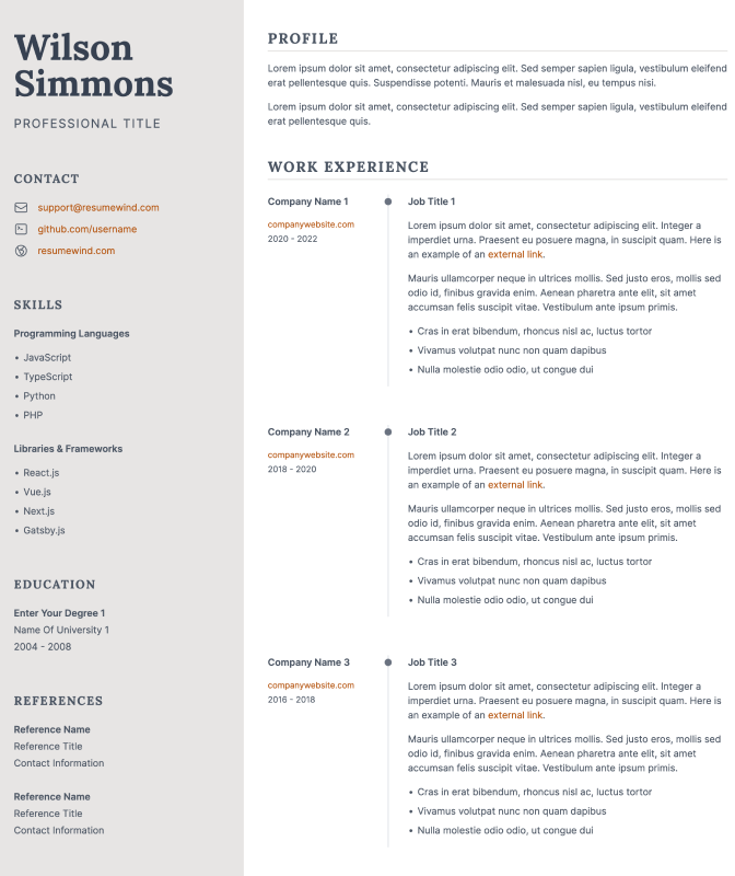 Resume Wind provides beautiful, mobile responsive resume templates in HTML format. You can easily edit your resume and have the flexibility to share it on the web.